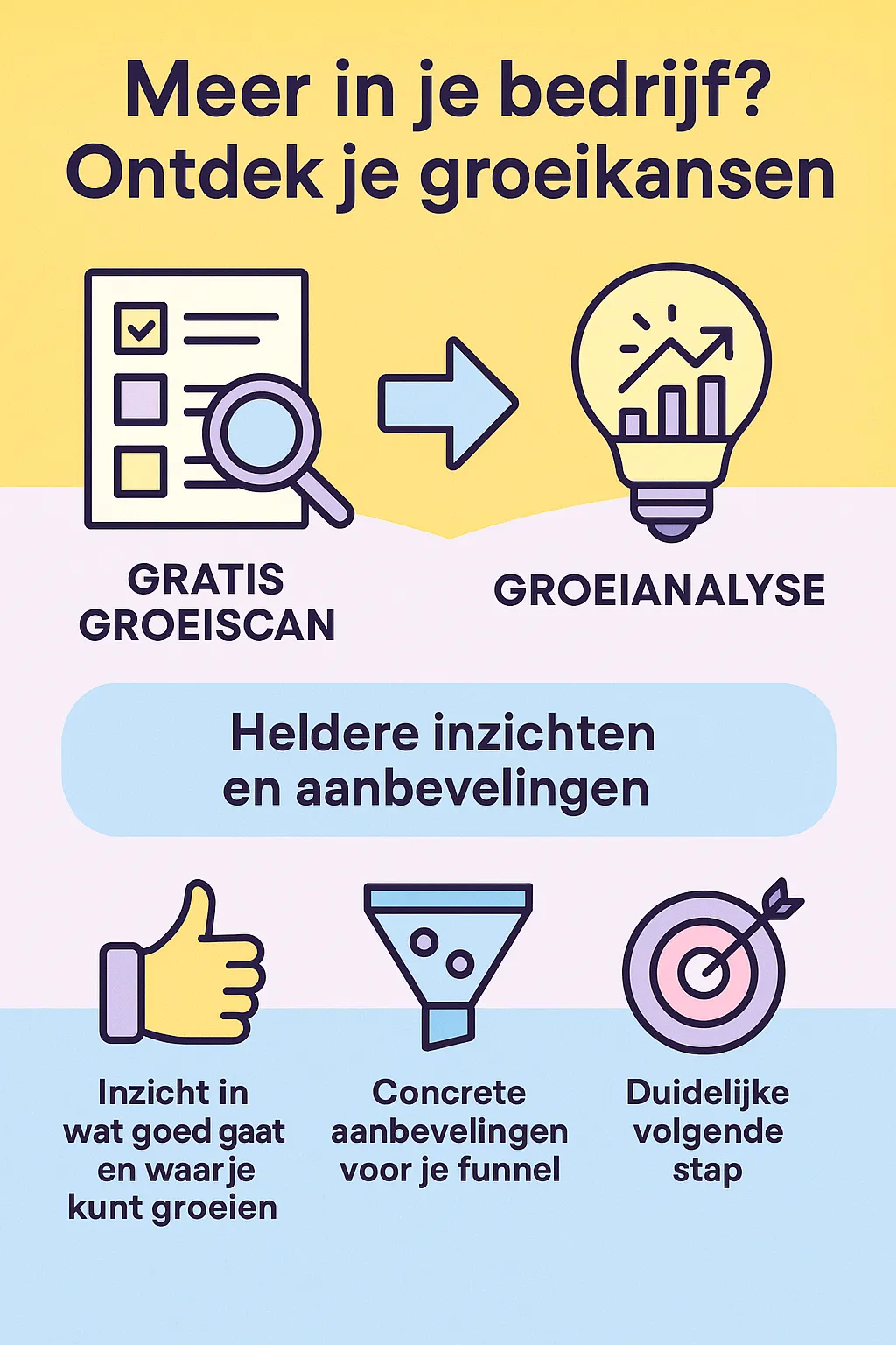 Met de gratis groeiscan en daarna de groeianalyse kijken we samen naar waar jij nu staat en waar je grootste groeikansen liggen. Geen verkooppraatje, geen vaag advies – maar heldere inzichten waar je direct iets mee kunt.